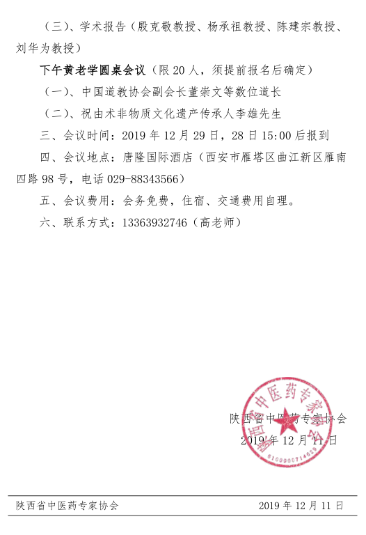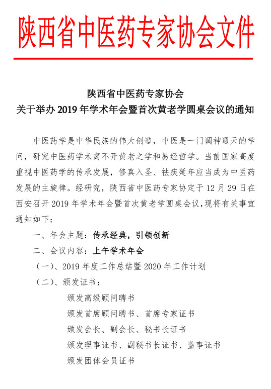 陕西省中医药专家协会关于举办2019年学术年会暨首次黄老学圆桌会议的通知