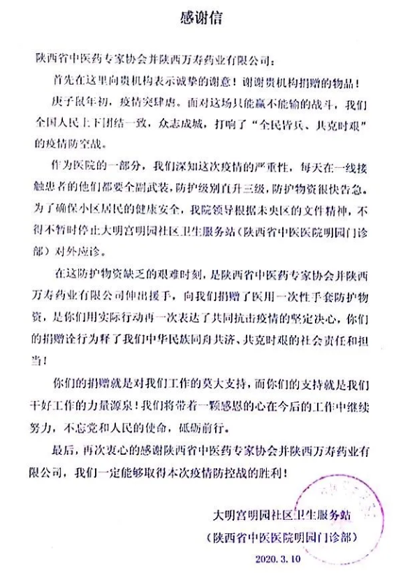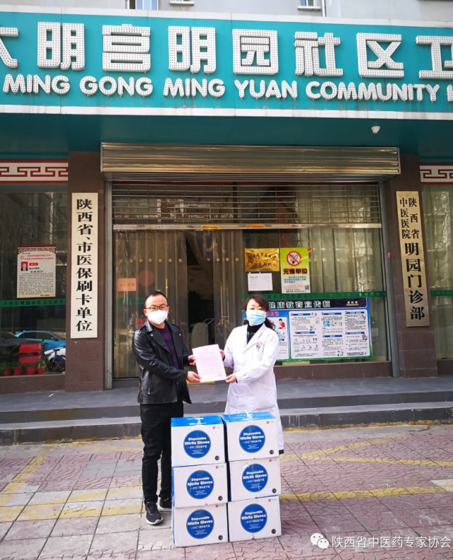 2020年3月10日上午,陕西省中医药专家协会携陕西万寿药业有限公司向未央区大明宫明园社区卫生服务站(陕西省中医医院明园门诊部)捐赠了3千双医用一次性丁腈手套,支援新冠肺炎防控时期社区医疗工作。