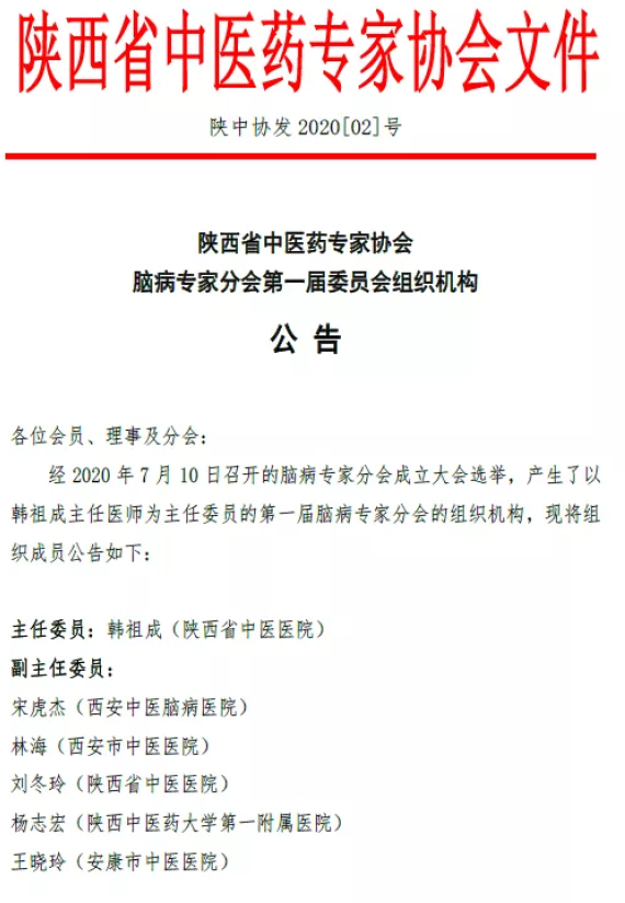 权威发布 | 陕西省中医药专家协会脑病专家分会第一届委员会组织机构公告