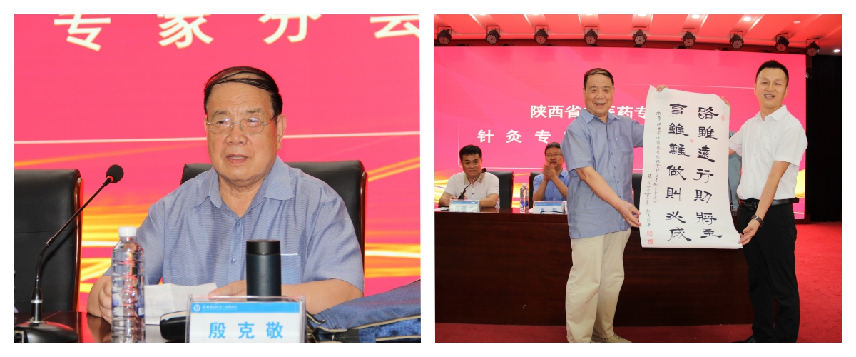最后,全国名老中医药专家殷克敬教授也对针灸专家分会的成立表示了热烈的祝贺,并做了激情洋溢的讲话。殷克敬教授强调了针灸学科在当代社会中的重要性,针灸专家分会的成立是我们陕西针灸医学发展的一件大事;针灸疗法具有无与伦比的思路和富有智慧的治疗方法,是其他医学无法比拟的;中医针灸人要聚是一团火、散是满天星,一定要利用好时代赋予我们的大好机遇,将针灸医学传承好、发展好,努力做到守正创新,为人类医学事业的发展贡献更大的力量、为推动人类健康事业的进步而奋斗终身。随后,殷克敬教授还为分会赠送了墨宝,题字为:路虽远行则将至,事虽难做则必成。希望针灸专家分会能够办的越来越好。